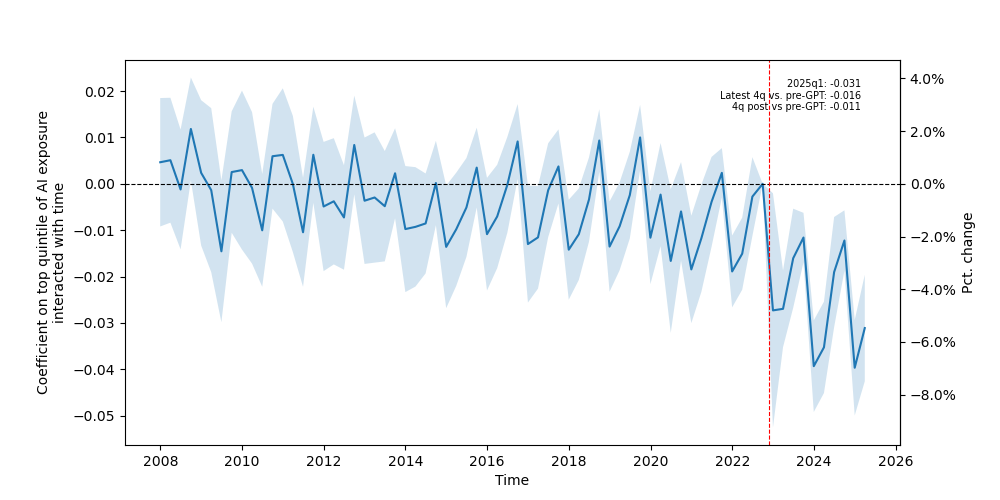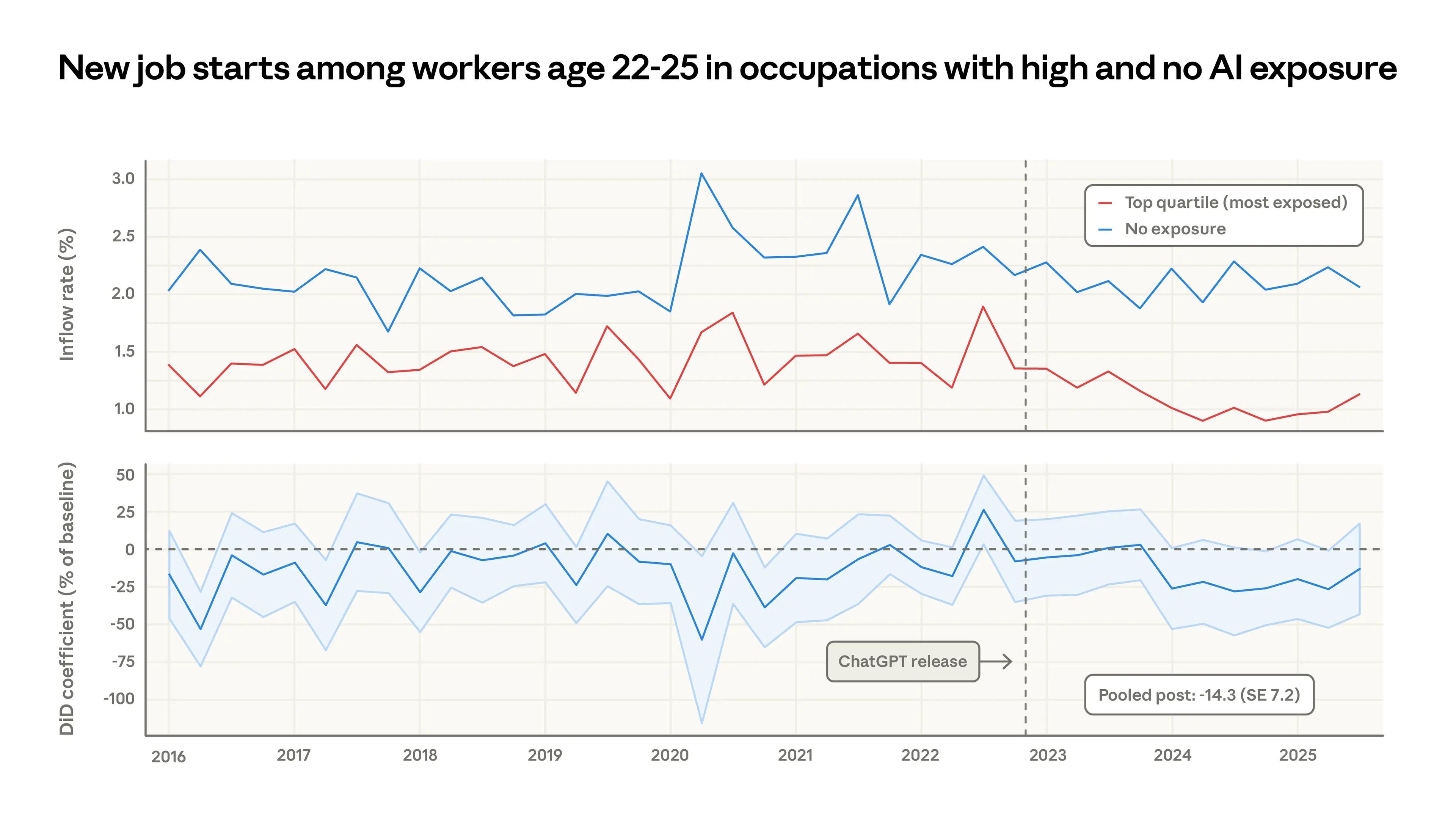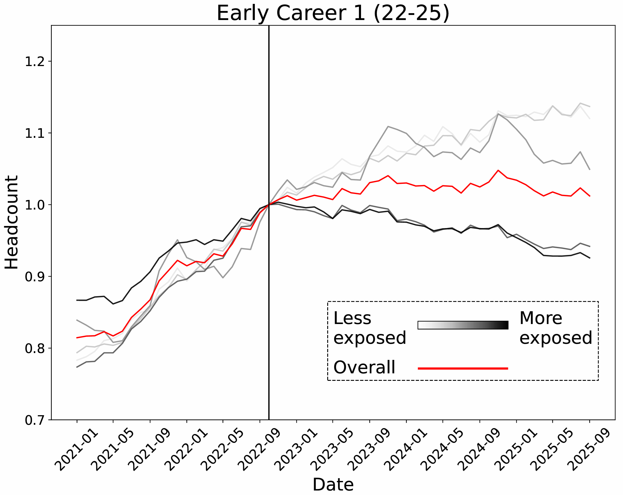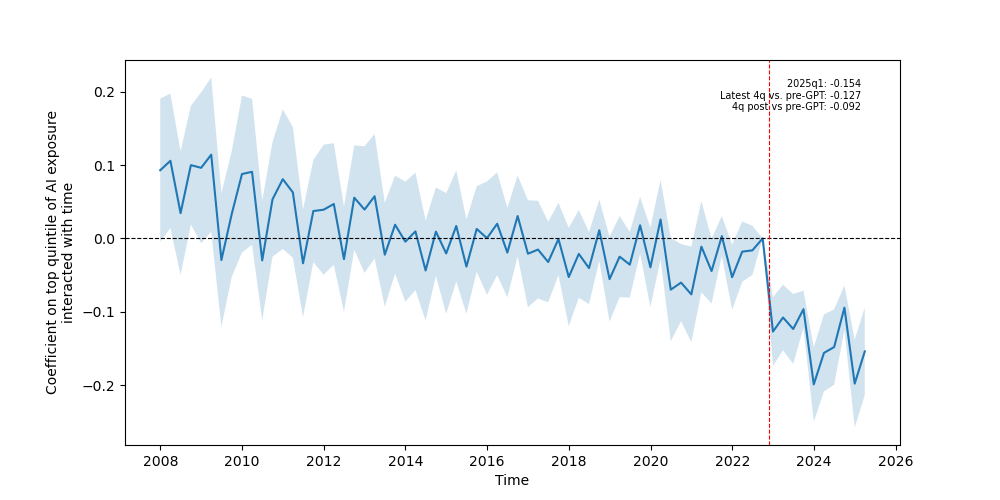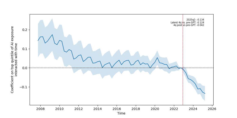Employment of early career workers (ages 22-24) in the most AI-exposed industries declined 15% (-159k jobs) in the 10 quarters following the introduction of ChatGPT.
