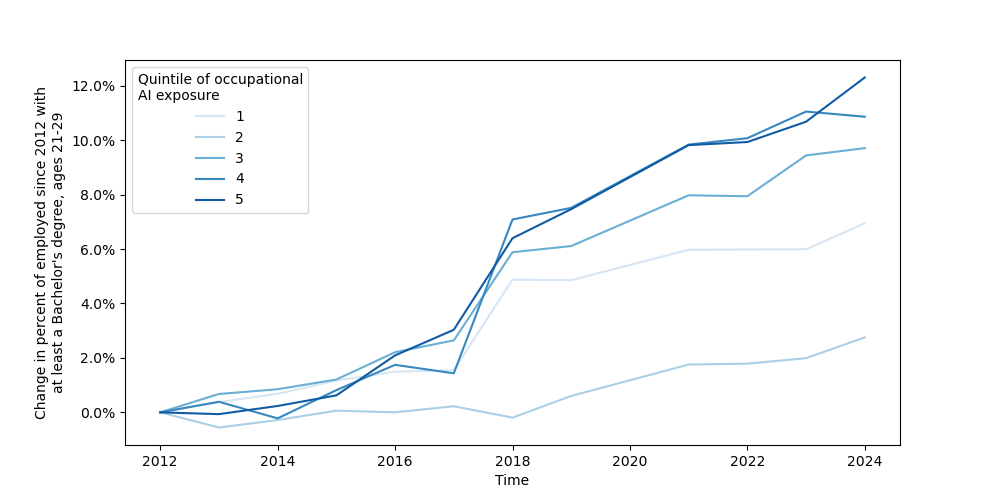 Educational attainment of young workers has increased most in the highest quintile of occupational AI exposure. This could be a source of delayed labor market entry.