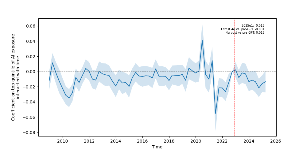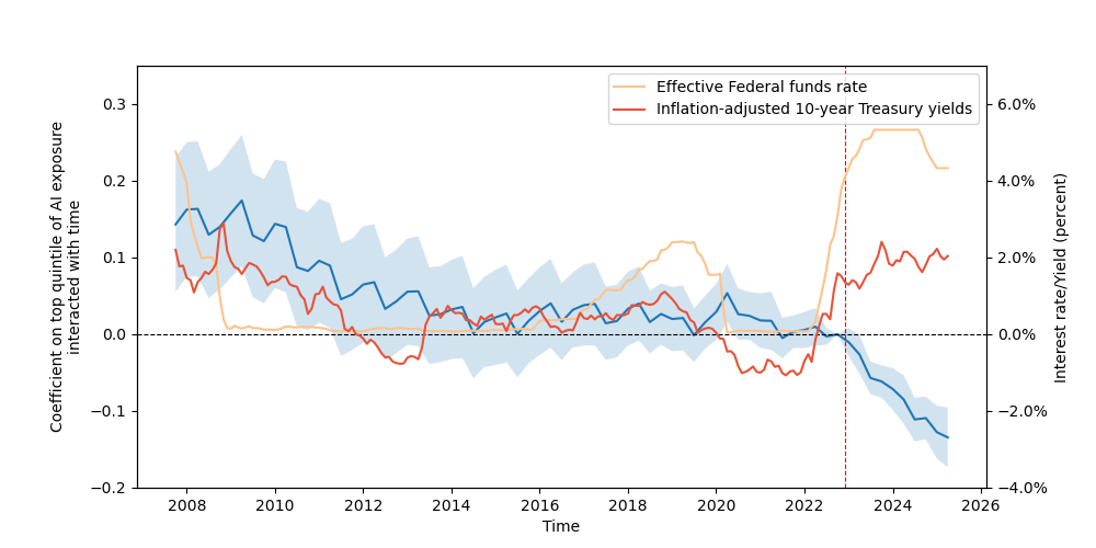 Crosswalking to industry allows us to test this hypothesis more formally by evaluating how AI exposure aligns with industries’ monetary policy sensitivity