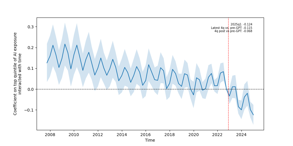 Early career employment in the most exposed quintile has declined 15% since 2022q4