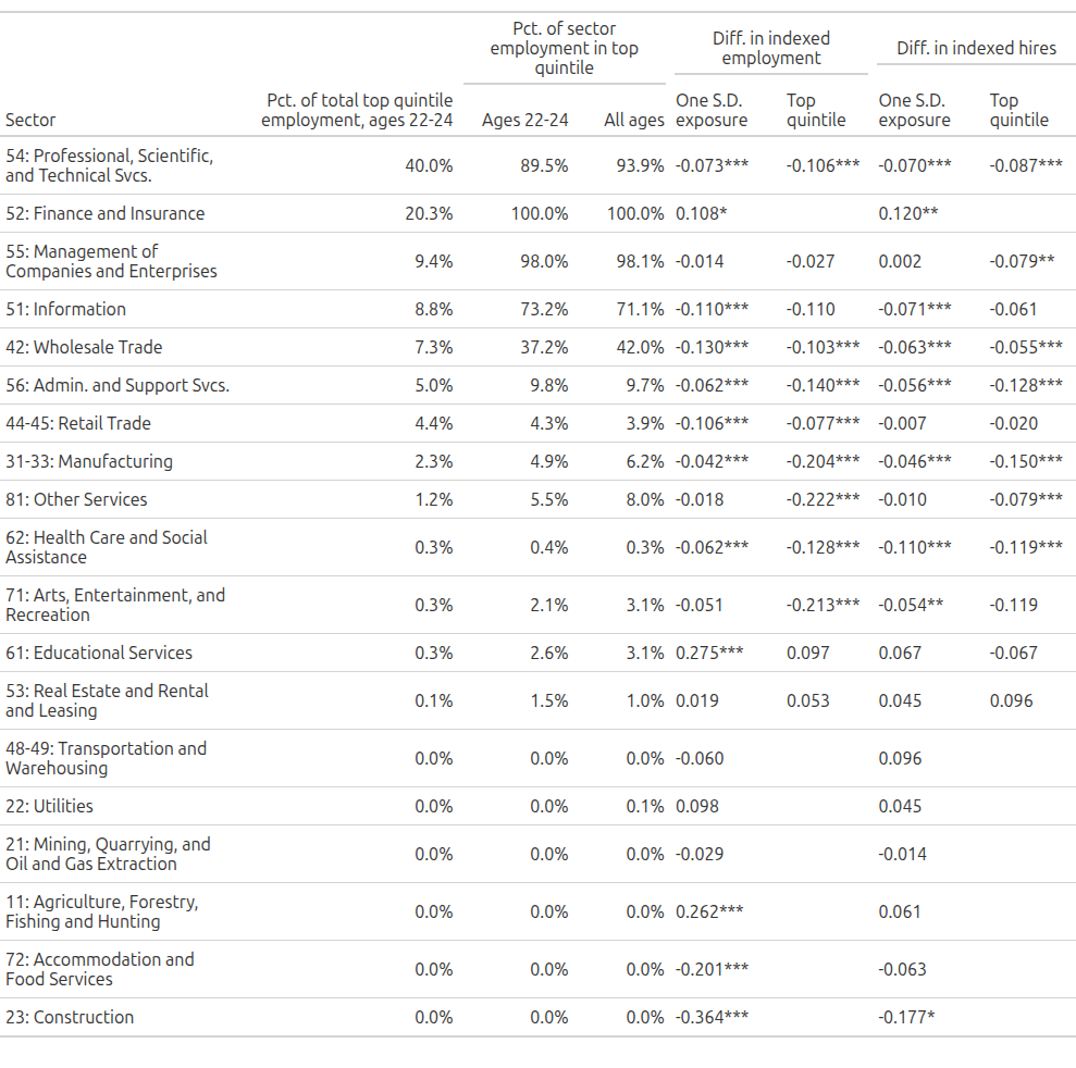 Declines in employment associated with AI exposure are broad-based across sectors.